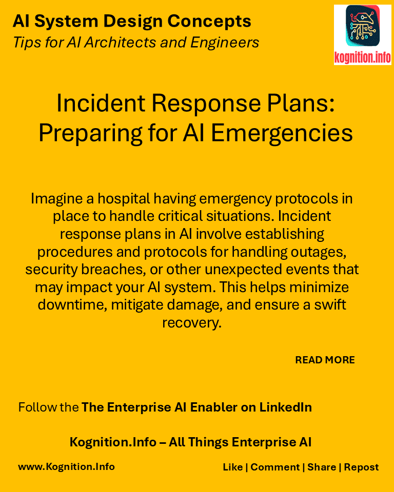 Imagine a hospital having emergency protocols in place to handle critical situations. Incident response plans in AI involve establishing procedures and protocols for handling outages, security breaches, or other unexpected events that may impact your AI system. This helps minimize downtime, mitigate damage, and ensure a swift recovery.
