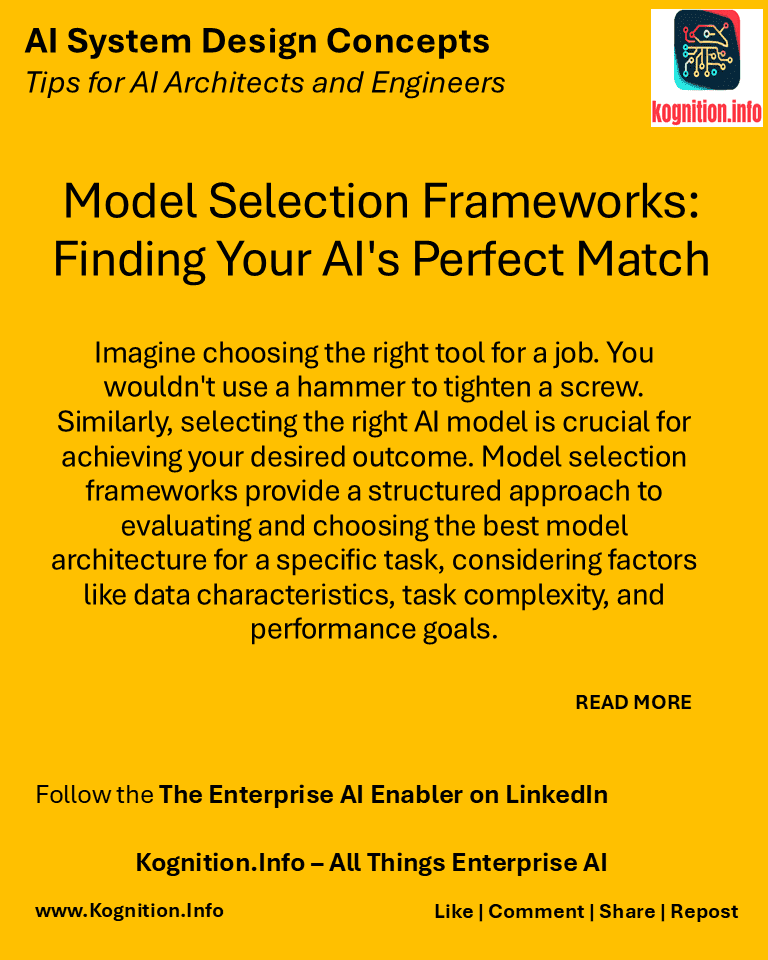 Imagine choosing the right tool for a job. You wouldn’t use a hammer to tighten a screw. Similarly, selecting the right AI model is crucial for achieving your desired outcome. Model selection frameworks provide a structured approach to evaluating and choosing the best model architecture for a specific task, considering factors like data characteristics, task complexity, and performance goals.