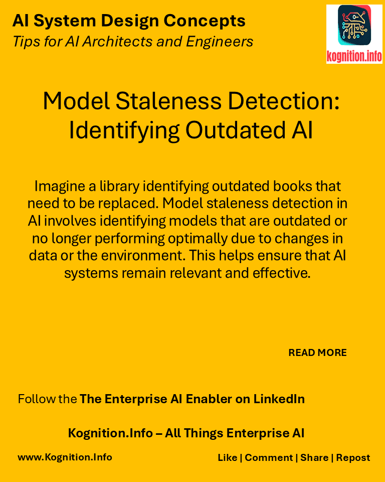 Imagine a library identifying outdated books that need to be replaced. Model staleness detection in AI involves identifying models that are outdated or no longer performing optimally due to changes in data or the environment. This helps ensure that AI systems remain relevant and effective.