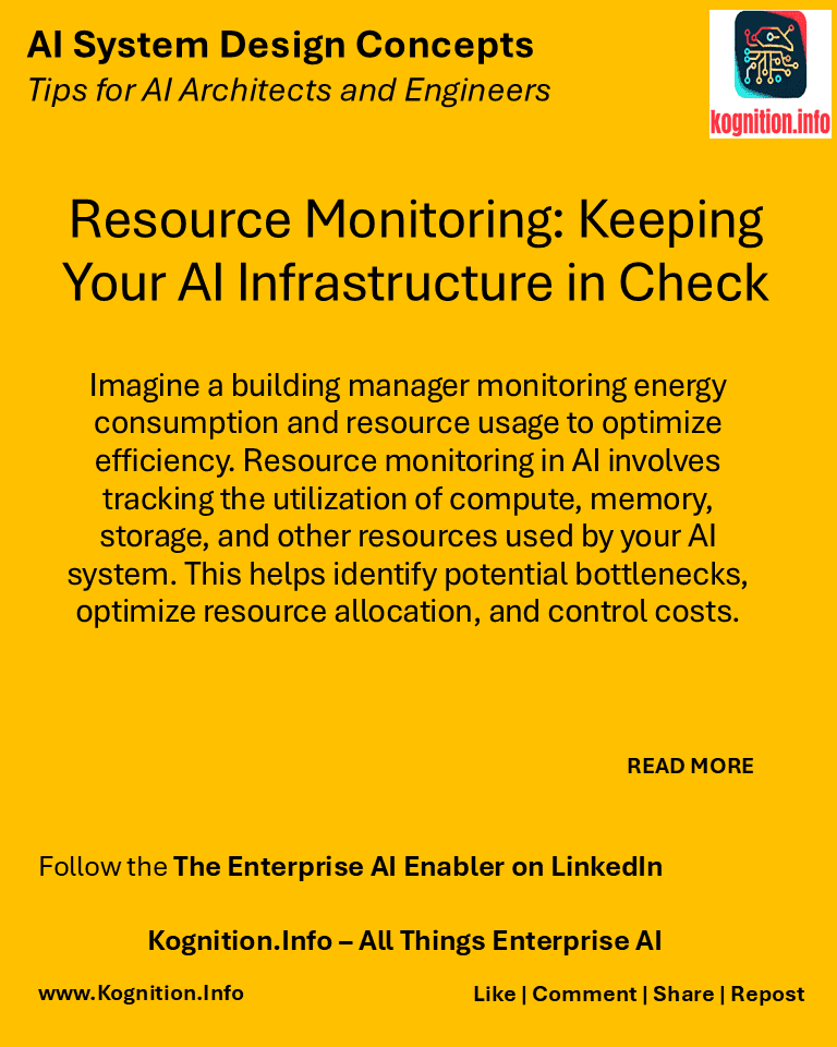 Imagine a building manager monitoring energy consumption and resource usage to optimize efficiency. Resource monitoring in AI involves tracking the utilization of compute, memory, storage, and other resources used by your AI system. This helps identify potential bottlenecks, optimize resource allocation, and control costs.