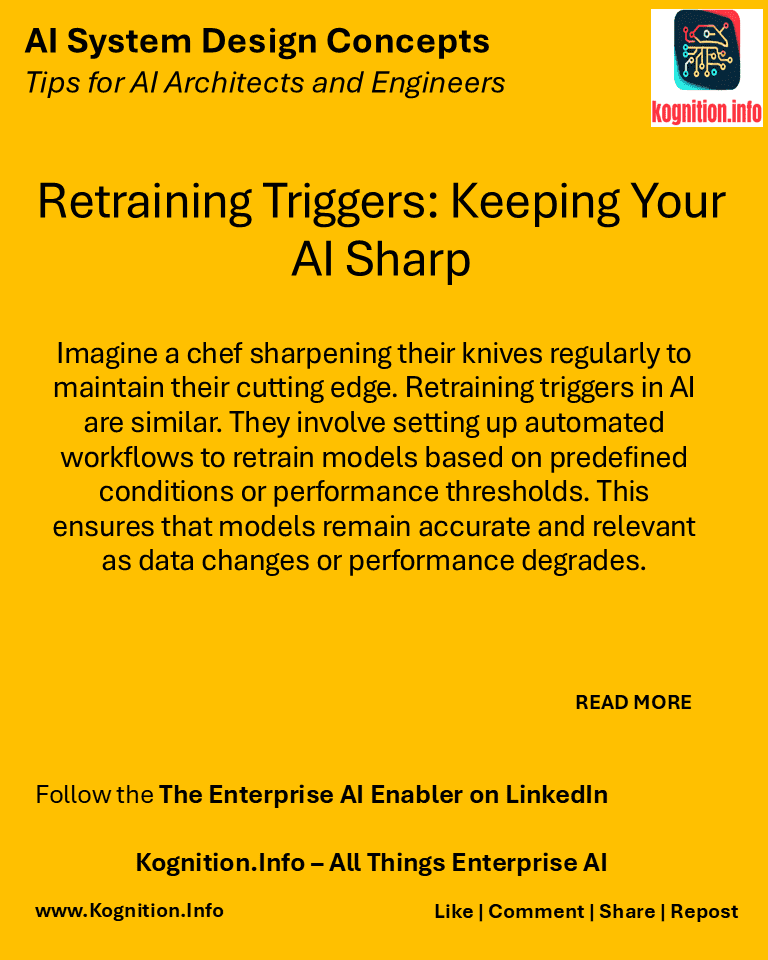 Imagine a chef sharpening their knives regularly to maintain their cutting edge. Retraining triggers in AI are similar. They involve setting up automated workflows to retrain models based on predefined conditions or performance thresholds. This ensures that models remain accurate and relevant as data changes or performance degrades.