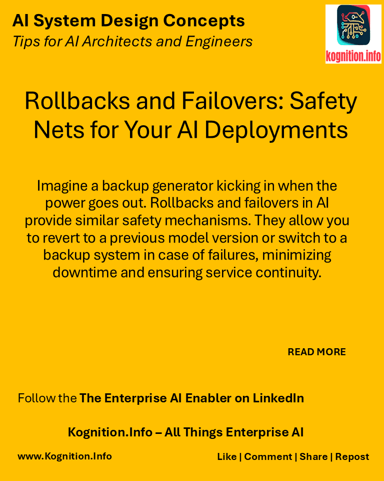 Imagine a backup generator kicking in when the power goes out. Rollbacks and failovers in AI provide similar safety mechanisms. They allow you to revert to a previous model version or switch to a backup system in case of failures, minimizing downtime and ensuring service continuity.
