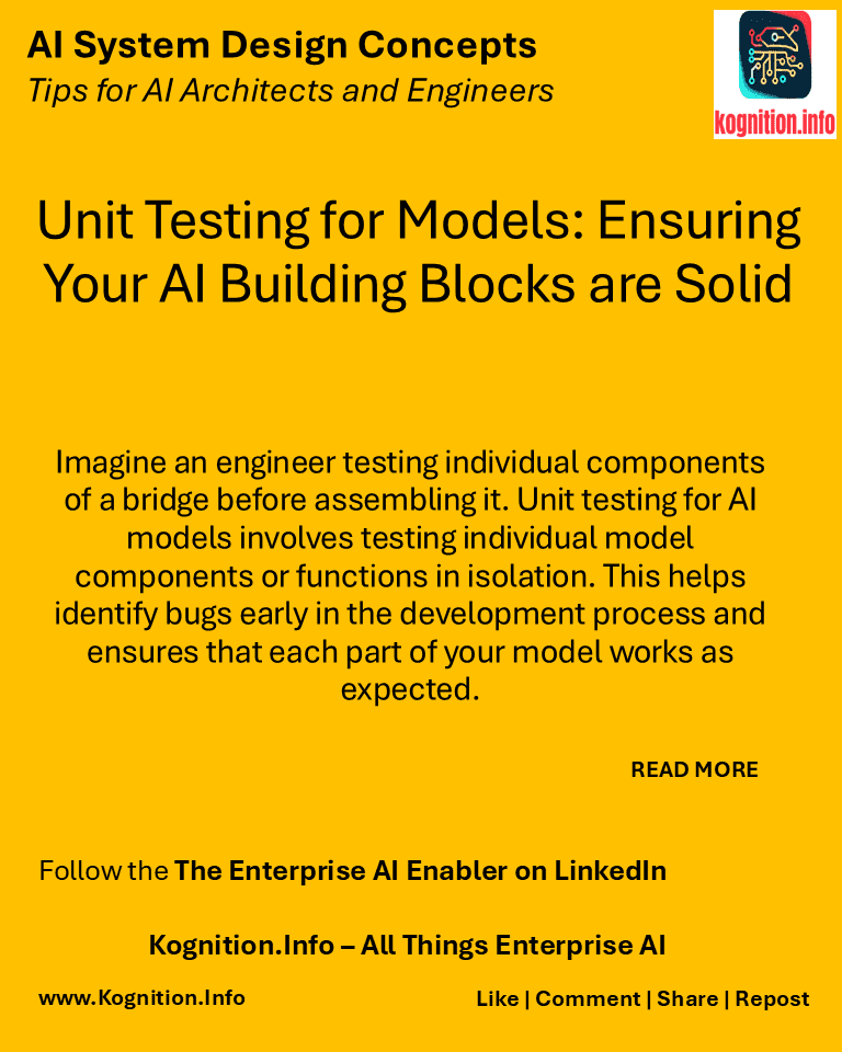 Imagine an engineer testing individual components of a bridge before assembling it. Unit testing for AI models involves testing individual model components or functions in isolation. This helps identify bugs early in the development process and ensures that each part of your model works as expected.
